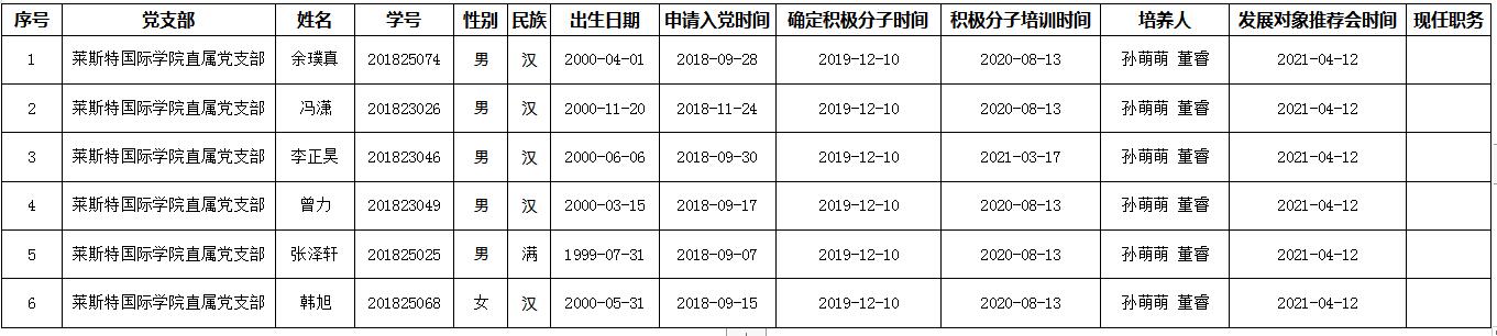 在听取培养联系人、党员和群众意见的基础上,经支部大会、支委会研究决定,拟确定余璞真等6名同志为发展对象,具体情况公示如下。