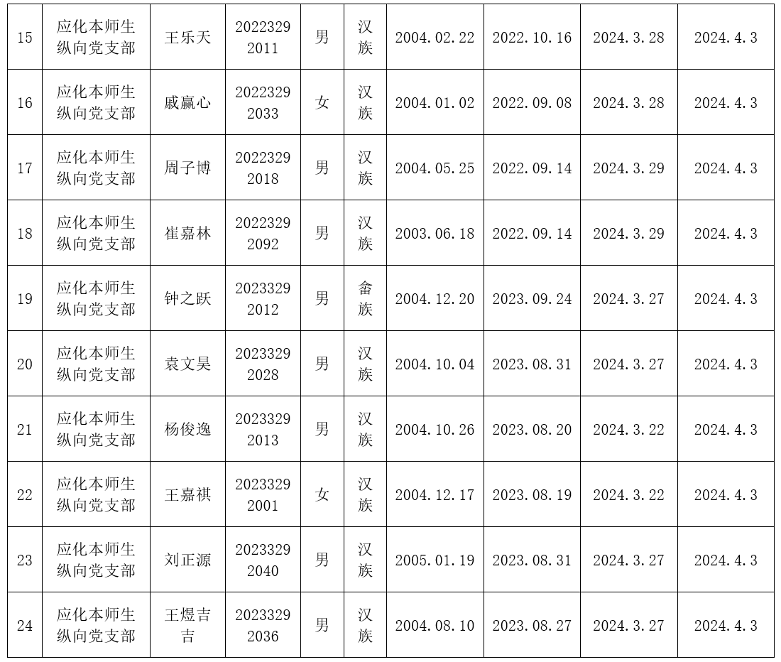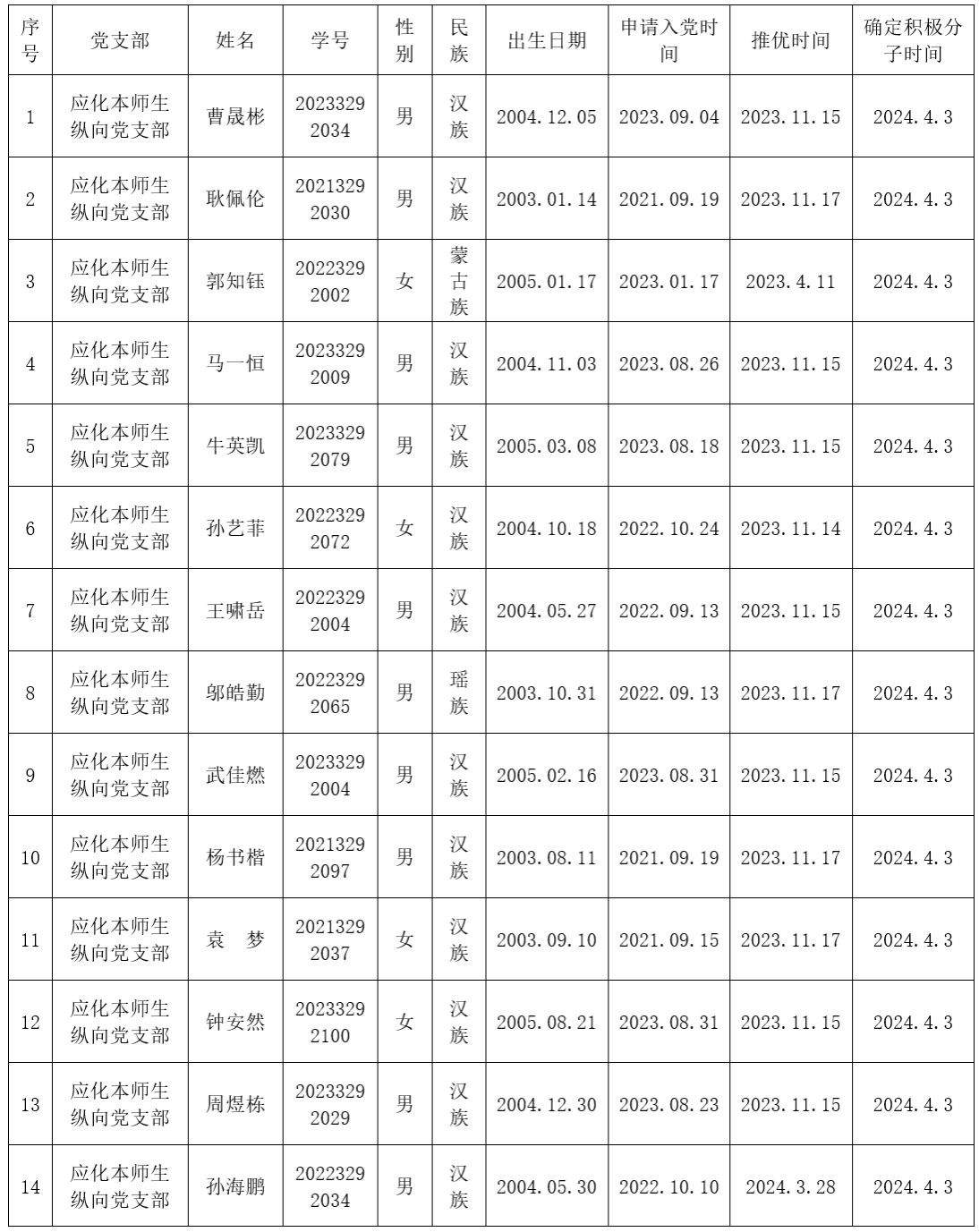 在听取培养联系人、党员和群众意见的基础上,经支部大会研究决定,拟确定曹晟彬等24名同志为入党积极分子,具体情况公示如下。