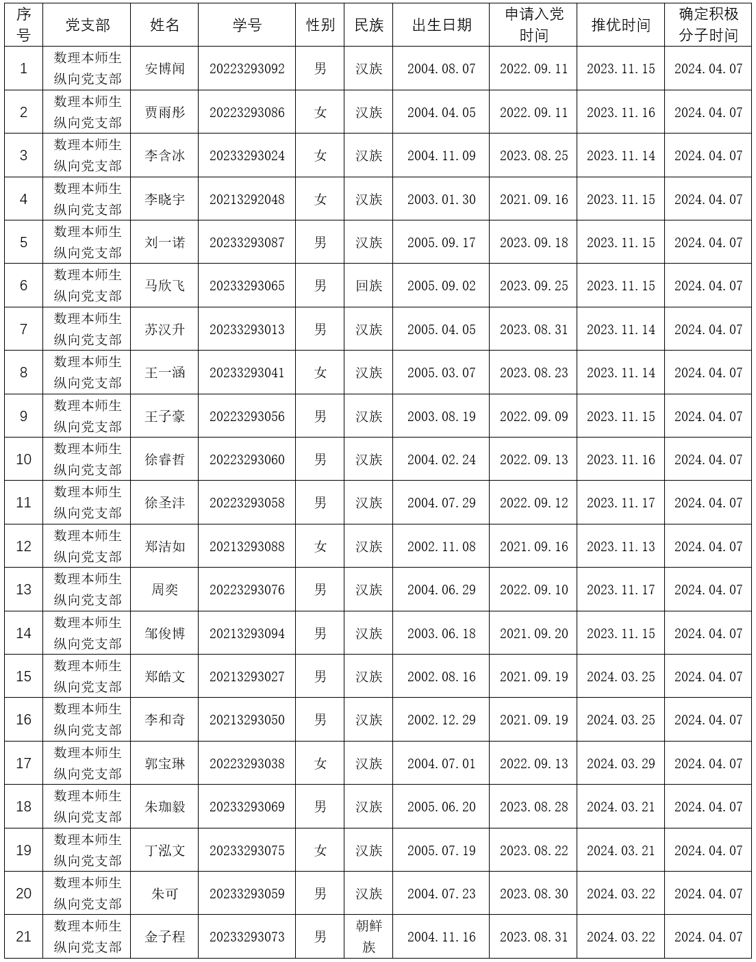 在听取培养联系人、党员和群众意见的基础上,经支部大会研究决定,拟确定安博闻等23名同志为入党积极分子,具体情况公示如下。