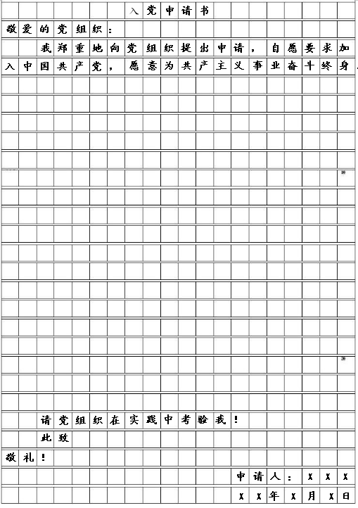 入党申请书,又称入党申请报告,是要求入党的人向所在单位的党组织提出的一种书面材料。入党申请书标志着申请人向党组织表明自己有入党的志愿和要求,使党组织了解申请人的政治信仰和追求,便于党组织对申请人有针对性地进行培养、教育、考察,同时也是党组织确定入党积极分子和发展对象的重要依据。写入党申请书,是要求入党的青年学生对党的认识和自我认识的反映。
