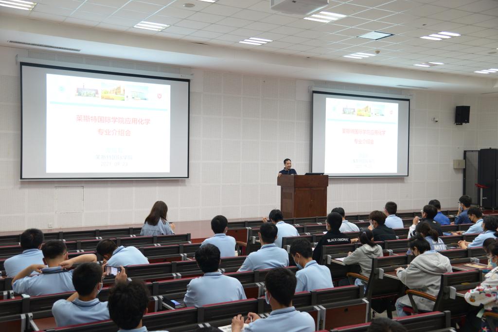 应用化学专业介绍会上谭振权分别讲述了学院概况,专业内涵,课程体系设置,人才培养等方面;让同学们对大连理工大学和莱斯特大学的背景进行了解,同时告诉同学们应用化学专业的涉及领域和当下应该如何确立目标。在讲座的后半段,谭振权针对新生们就专业学习、就业考研等方面的问题详细地答疑解惑,帮助同学们对未来四年的大学学习生涯提前做好规划。