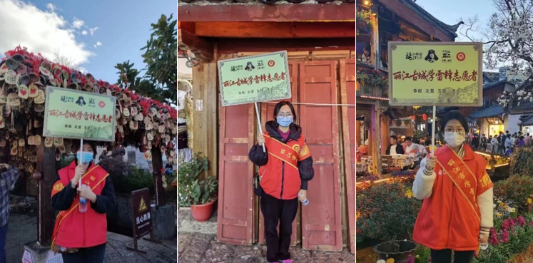 同时,实践团成员们走进丽江古城,参与“丽江古城学雷锋志愿者”活动,努力让雷锋精神在新时代熠熠生辉。在得知丽江古城旅游服务中心处于旅游旺季,正在招募志愿者后,实践团成员们在赵玲玲、赵天蔚老师的指引下,立即着手准备开展相关志愿服务工作。