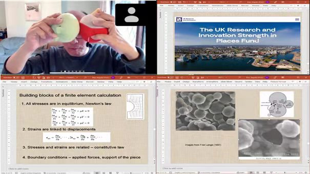 第三场报告是由莱斯特大学工程学院、莱斯特国际学院英方院长潘敬哲教授带来的《Digital Twin of Advanced Ceramics Manufacturing》。首先,潘教授利用微观和宏观的陶瓷烧结图片吸引同学们的注意,引入今天讲座的主角——陶瓷,并进而引申到此次讲座的主题:陶瓷生产过程中的数字孪生体。潘教授通过卡通玩偶与同学亲切互动,生动形象地展示出烧结过程中两个分子的相互作用,并通过一系列科研图片来让大家观察到陶瓷分子在烧结过程中确实是存在数字孪生体并确认了数字孪生体的性质。