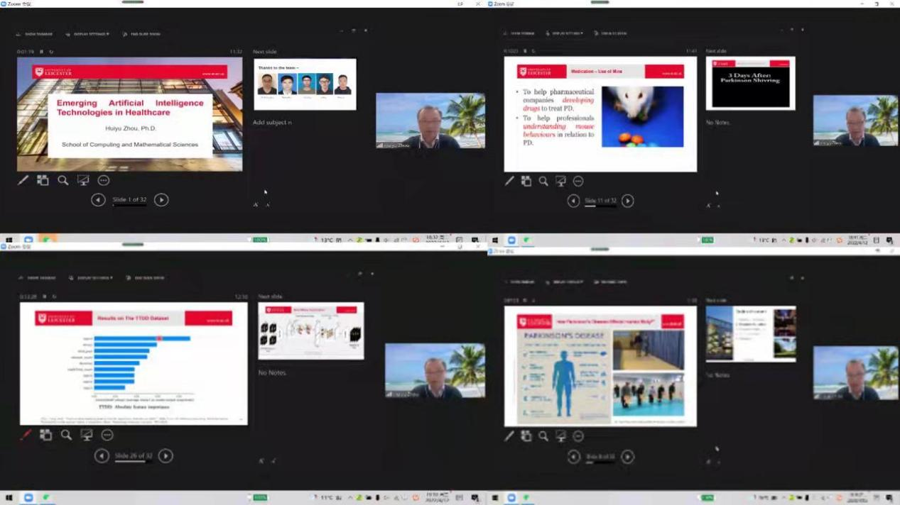 第二场报告是由莱斯特大学计算机及数学科学学院的周挥宇教授向大家讲述医疗领域新兴的人工智能技术。周教授从帕金森疾病的病理引起,并借助患帕金森疾病小鼠行为进行分析,总结人工智能技术应用于医疗的作用以及它对于医疗技术提升的意义。