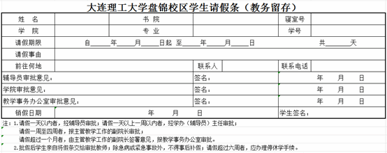 学生因病、因事请假应至少提前一天到C07-202办公室填写纸质版《大连理工大学盘锦校区学生请假条》,并由辅导员审批签字。