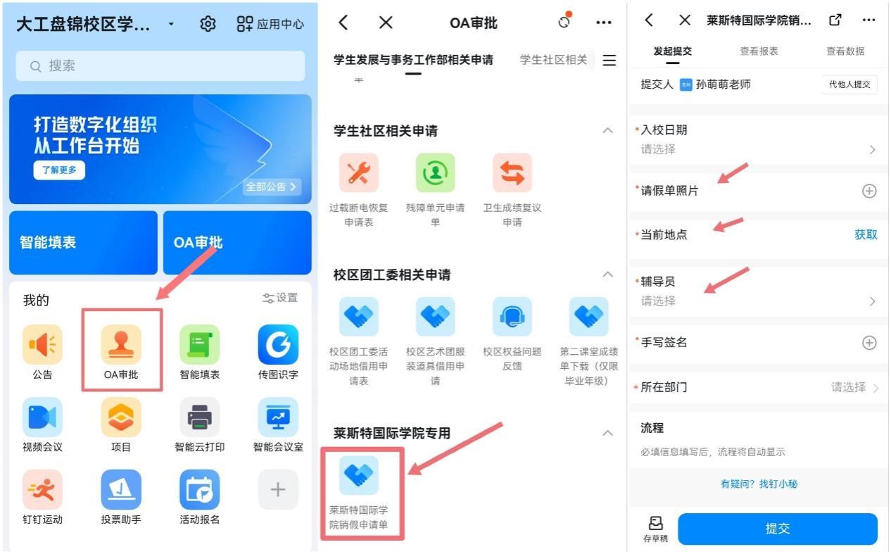 2. 学生请假出校者,应于返校后通过“钉钉”APP进行销假。具体流程为OA审批-莱斯特国际学院专用-莱斯特国际学院销假申请单-填写表单内容后选择辅导员老师提交。