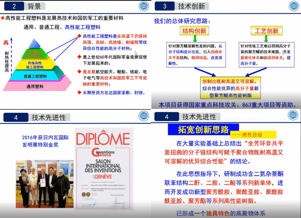 “创新不息,建设科技强国”,在导论课的开始,蹇院士便鼓励同学们肩负强国使命,不断学习、勇于创新。“结构决定性能”,针对聚芳醚溶解性差的问题,蹇院士从结构设计出发,引入扭曲非共平面结构,阻碍结晶、改善溶解性。同时,蹇院士从工艺上创新,开发新催化体系和新溶剂体系,创制出既耐高温又可溶解的高分子量新型聚芳醚高性能树脂。接下来,蹇院士还成功研制出含二氮杂萘酮联苯结构二酐、二胺、二酸等系列新单体,进而开发成功新型聚芳酰胺、聚酰亚胺、聚酰胺酰亚胺、聚芳酯等系列高性能树脂,形成一个独具特色的高聚物体系。蹇院士详细介绍了杂萘联苯高性能树脂的深加工应用,及其在航空航天、核能、武器装备、舰船等高技术领域的广泛应用。