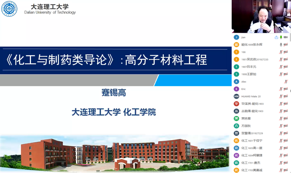 5月24日上午9:30,化工学院盘锦分院第七次导论课“高分子材料工程”在zoom上精彩开讲,中国工程院院士,亚太材料科学院院士、大连理工大学教授、高分子材料研究所所长、辽宁省高性能树脂工程技术研究中心主任蹇锡高教授,百忙之中牺牲周末休息时间向化工学院盘锦分院和莱斯特国际学院师生讲述了自己的科研创新之路。