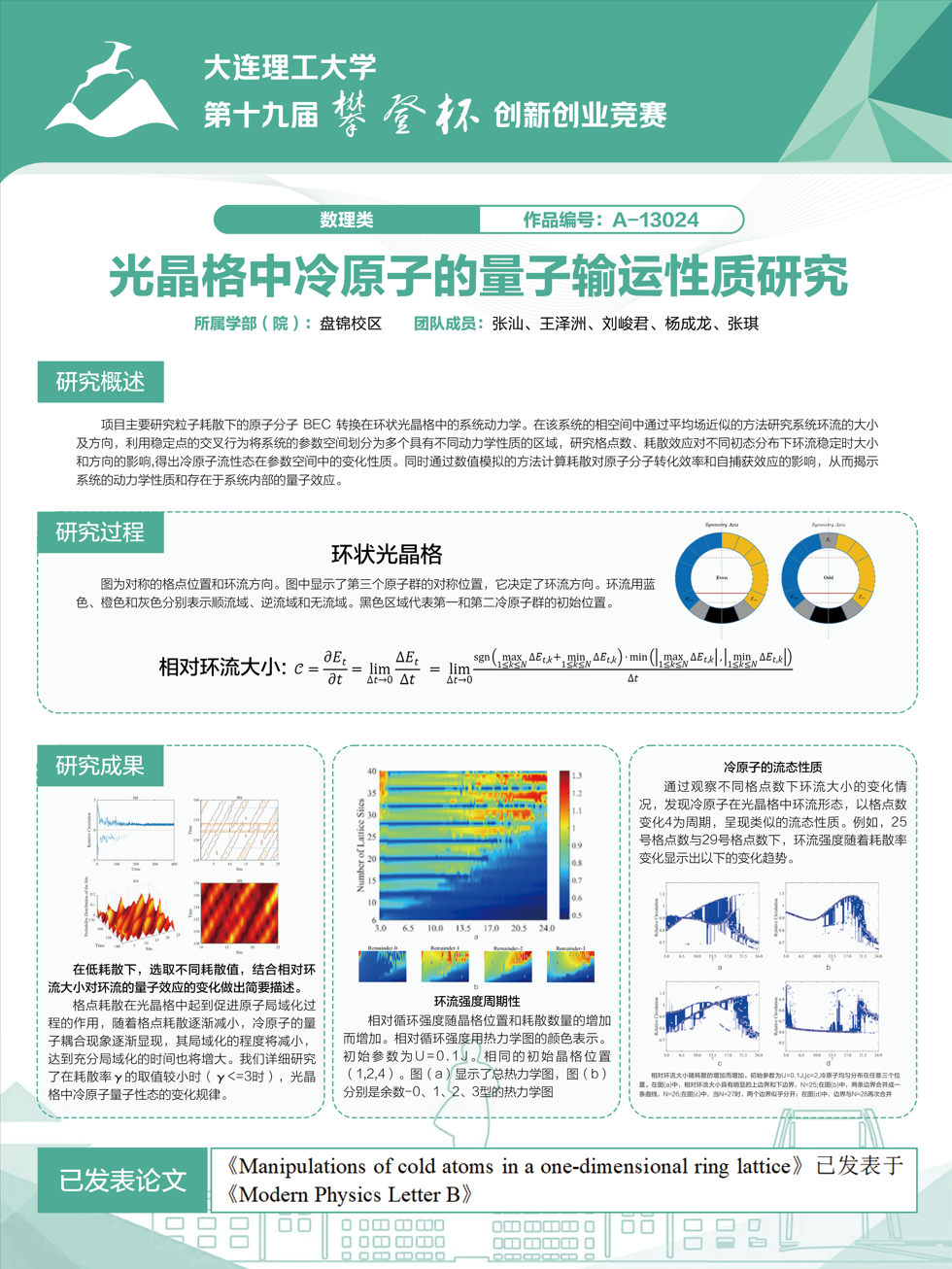 此外,2021级本科生杨成龙、张琪在崔博老师的指导下继续沿着该课题方向不断深入研讨,项目《光晶格中冷原子量子输运性质研究》荣获第十九届大连理工大学攀登杯创新创业竞赛一等奖,并通过学校推荐参加第十六届“挑战杯”辽宁省大学生课外学术科技作品竞赛。