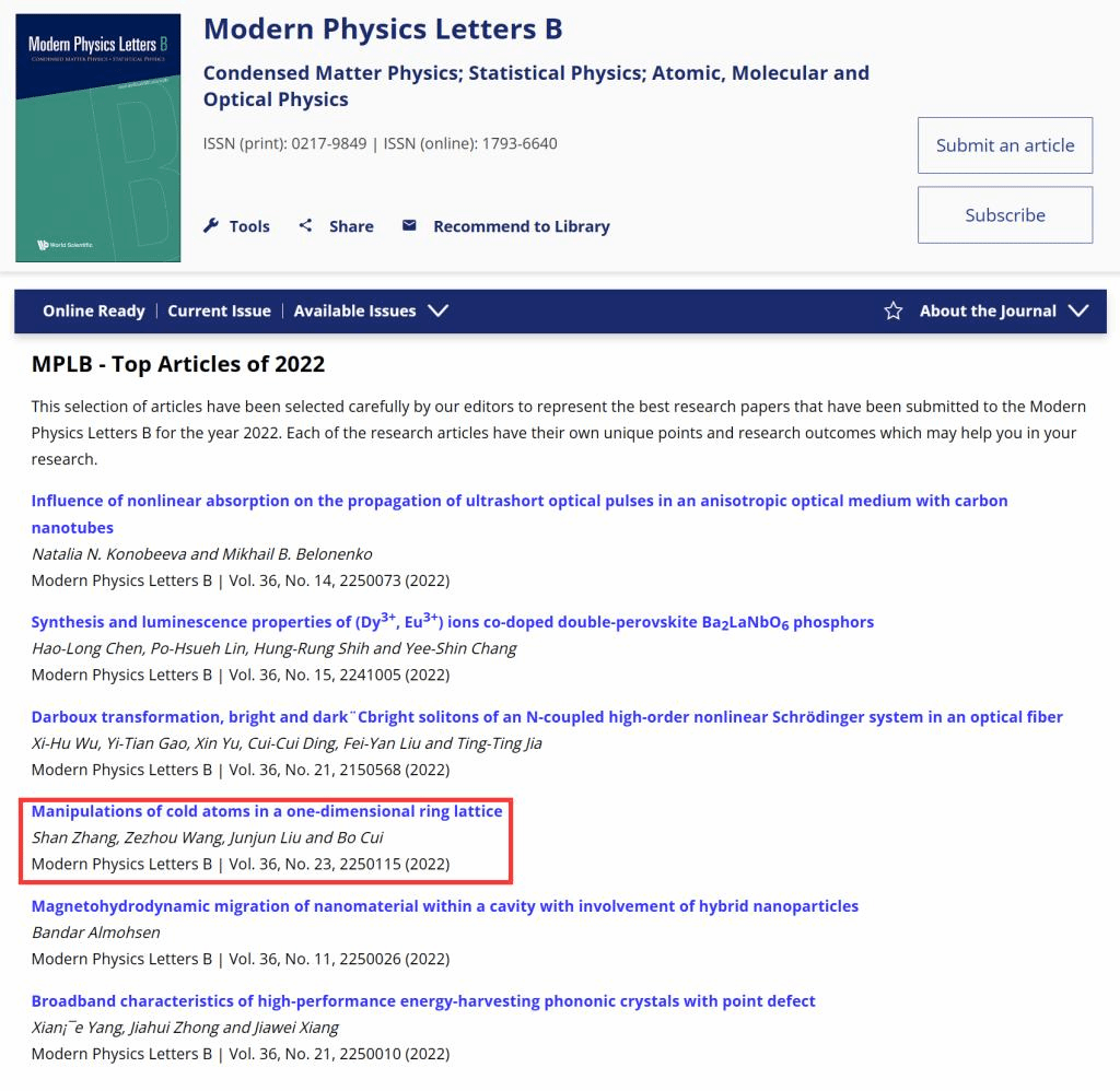 据悉,《现代物理快报B》是被国际数据库SCIE、SCI收录的权威期刊,为凝聚态物理、统计物理以及原子、分子和光学物理领域中最重要和最新的研究成果的快速流通提供了渠道。2022年,该期刊发文量超过400篇,而此次最佳论文榜单仅有6篇文章入选。