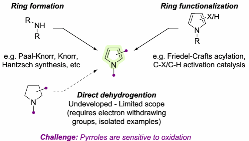 吡咯是一种重要的结构单元,在药物、染料、半导体和传感器等材料中得到广泛应用。合成吡咯除了可以通过成环反应或环功能化反应之外,也可以通过吡咯烷的直接脱氢来实现。然而,由于吡咯对氧化条件敏感,直接脱氢制备吡咯的方法较少,通常限于使用带有吸电子基团的吡咯烷。