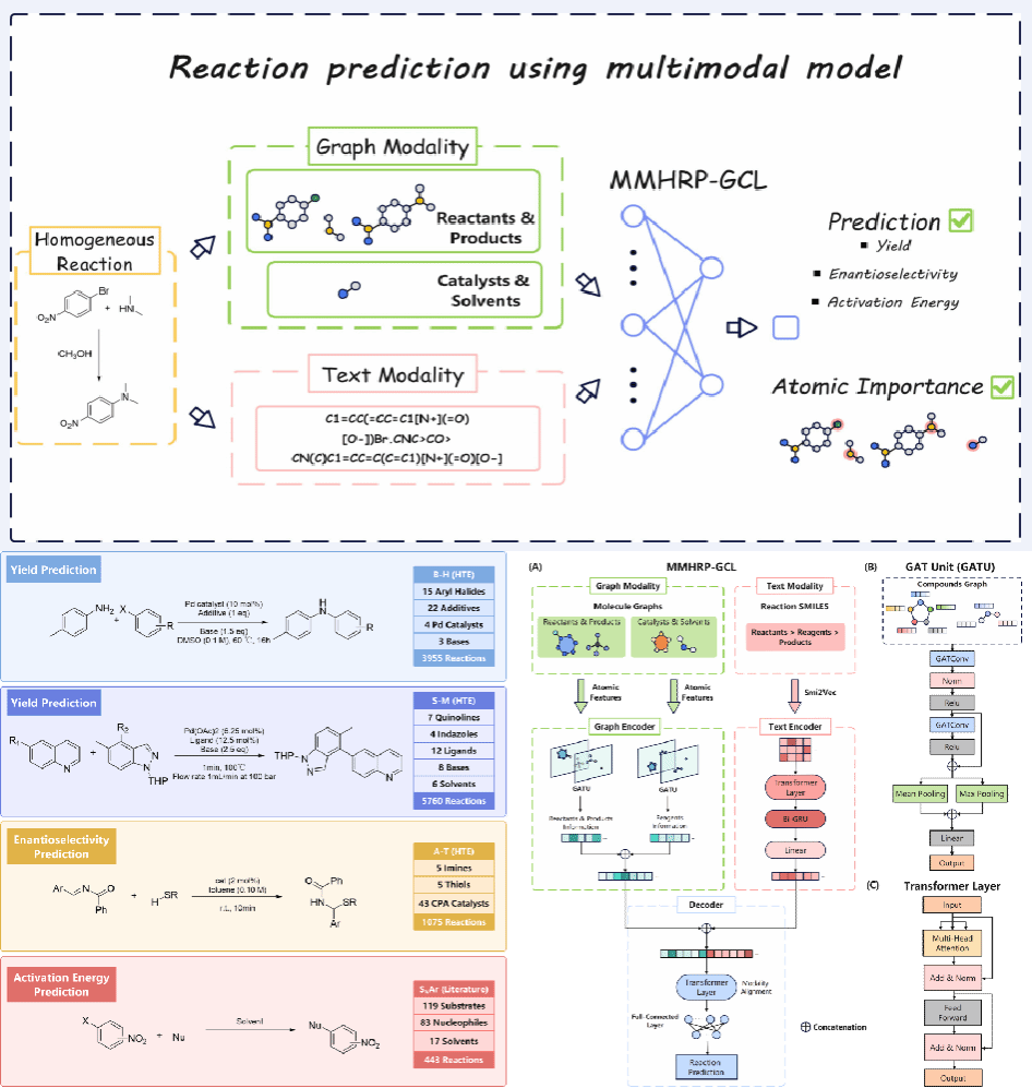 化学反应性能的准确预测可为化学合成领域的发展提供重要的理论依据。为此,本文提出了一种名为MMHRP-GCL的新型多模态模型,该模型通过融合文本和图像两种模态的信息,实现对均相化学反应的产率、对映选择性和活化能的预测。该模型仅需8个简单描述符与反应的简化分子线性输入规范(Reaction SMILES),无需高成本的密度泛函理论(DFT)计算,且能够处理涉及分子数量不定的反应。在4例数据集上的实验结果表明,MMHRP-GCL的性能至少优于7种通用的先进方法。消融实验证实了图模态和文本模态互补的关键作用,以及模态对齐和原子特征在预测中的重要性。尽管在解释原子间关系方面仍有改进空间,但该模型识别重要原子的能力十分出色。对特征重要性的统计研究以及在具挑战性的数据集上的测试,进一步表明了该模型的实用性和潜力。作为一种高精度、低成本、可解释且通用的多模态模型,MMHRP-GCL为均相催化反应正向预测器的设计提供了有价值的指导。
