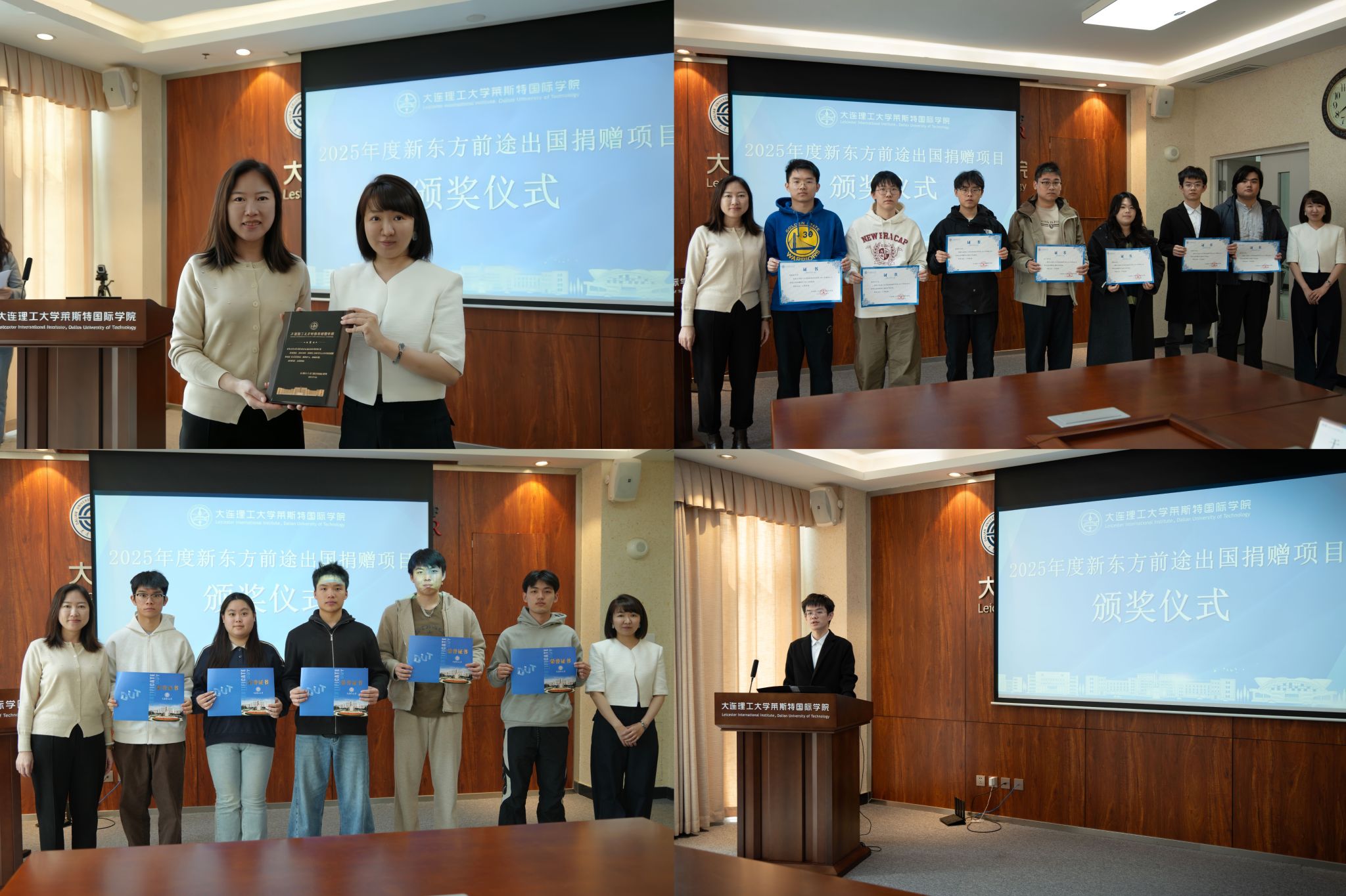 4月8日下午,大连理工大学莱斯特国际学院在C07-207举办2025年度新东方前途出国捐赠项目颁奖仪式。大连新东方前途出国总经理张金玲及各地区负责人,莱斯特国际学院党委副书记兼副院长赵玲玲、学生工作办公室及全体获奖学生出席本次仪式。