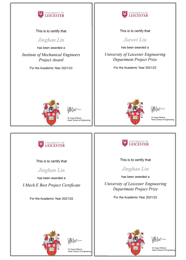 这些奖项旨在表彰毕业生在毕业设计中取得的突出成绩。“Engineering Department Project Prize”是由莱斯特大学颁发的优秀毕业设计奖,“Institute of Mechanical Engineering Project Award”和“I.Mech.E Best Project Certificate”是机械工程师学会(IMechE)颁发给在研究、开发和设计项目中表现突出的毕业生,其中,“I.Mech.E Best Project Certificate”是经学院系主任提名,学会审核评定后颁发,每个专业只有一位毕业生能获得该奖项。