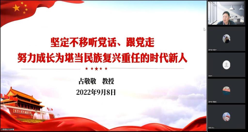 占敬敬以《坚定不移听党话、跟党走,努力成长为堪当民族复兴责任的时代新人》为题,站在历史维度深入剖析中国共产党的初心和使命,以鲜活的案例和详实的数据向同学们阐释“中国共产党为什么能”和“我们该怎么做”,激励新生时刻牢记学院“越国际,越爱国”教育理念,在学校向着一流大学建设“三步走”战略目标“加速跑”的新征程上,以青春奋斗之姿,从见证者成长为建设者,勇担使命、堪当大任!