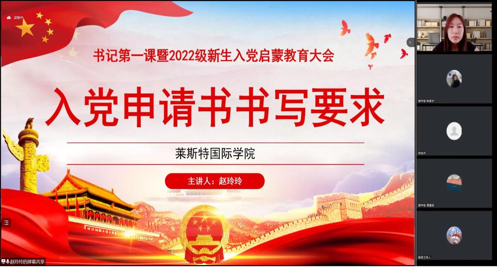 为增进学院新生对党的认识,引导新生端正入党动机,积极向党组织靠拢,9月8日下午,莱斯特国际学院线上召开书记第一课暨2022级新生入党启蒙教育大会,校长助理兼盘锦校区党工委书记、管委会主任、莱斯特国际学院直属党支部书记、院长占敬敬,莱斯特国际学院直属党支部副书记兼副院长赵玲玲及2022级全体新生参加了此次大会。大会由学院直属党支部组织员徐连杰主持。