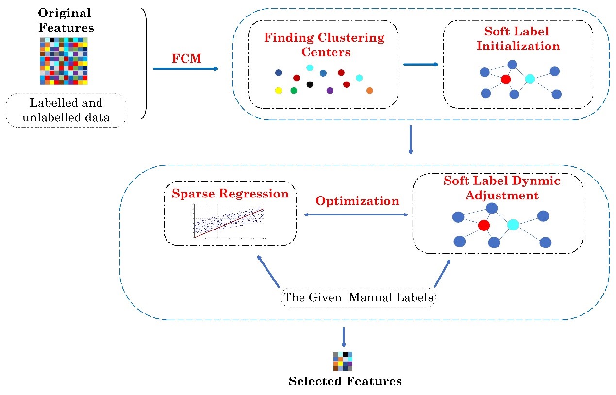 论文聚焦于现存半监督特征选择方法的一些问题,例如,大多数现有方法忽略了数据的模糊性,且许多方法需要衡量所有样本之间的关系,效率较低,难以应用到大规模数据集上。为了解决上述问题,该论文提出了一种有效的基于软标签学习的半监督特征选择(SFS-SLL)方法。具体而言,首先利用高效的Fuzzy C-Means聚类算法,基于样本之间的局部距离和聚类中心学习初始软标签,并通过一种监督语义约束模块,利用已有标签信息作为软标签学习的指导,以提高软标签质量。该文提出了一个简单而有效的稀疏回归模型,将软标签学习和特征选择集成到一个统一的框架中。最后,基于交替方向乘子法(ADMM)得到了一种有效的优化策略,迭代地求解提出的目标函数。在多个数据集上的实验结果表明,与比较方法相比,该文中提出的方法在特征选择准确性和效率方面取得了改进。