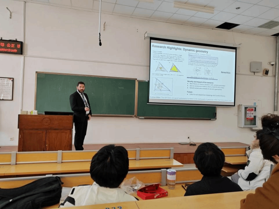 Ovidiu Bagdasar以他特有的风趣和幽默,分享了他在世界各地开展的数学学习、交流与教学活动,深入浅出介绍了交流网分析,动态几何以及多项式等数学领域的前沿动态。在谈到动态几何时,Ovidiu Bagdasar详细阐述了这一领域的核心知识,从几何基础出发,构建了一系列动态几何的经典模型。此外,Ovidiu Bagdasar在讲座中还介绍了当代数学家已完成研究证明的定理,与师生们探究该专题的未来研究方向,激发了同学们对数学学习的热情。
