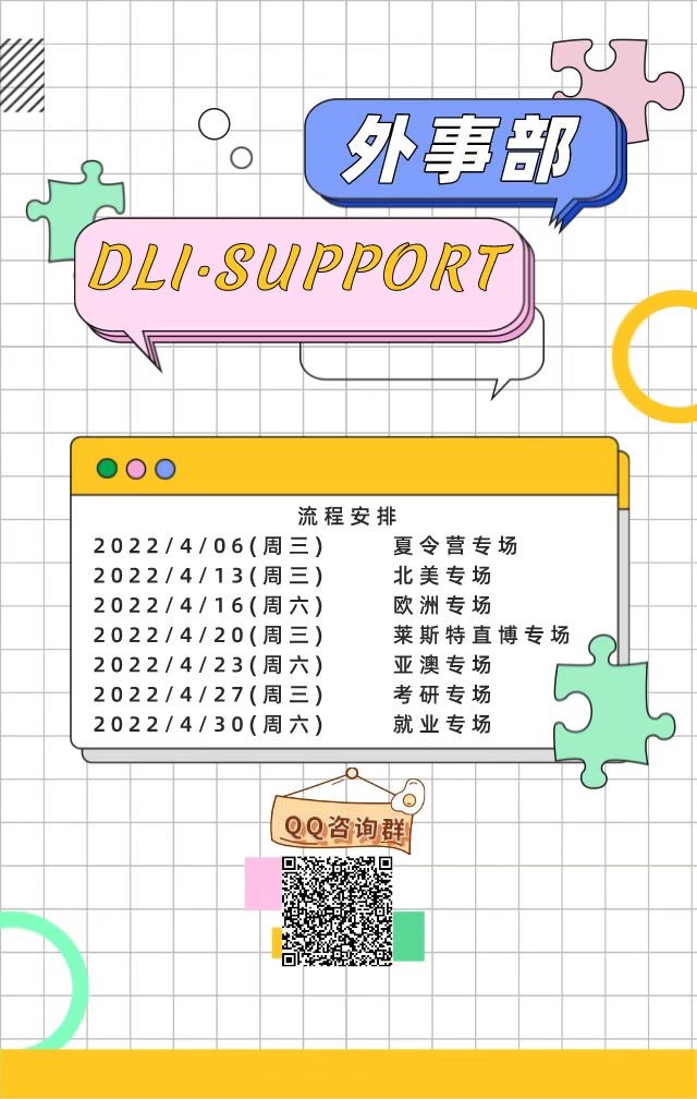 为进一步帮助校区学子明确目标方向,合理规划未来,开阔国际视野,DLI·SUPPORT系列活动将邀请莱斯特国际学院优秀应届毕业生和校友针对出国留学、考研和就业方向,通过七场线上会议进行经验分享,答疑解惑。“云端分享”助你职业规划,邀你展望未来!