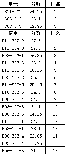 其中寝室分数排名前三位的大二及以上寝室(B11-502-2、B11-504-3、B08-306-1),获得推荐参与校区寝室文化建设大赛的资格。