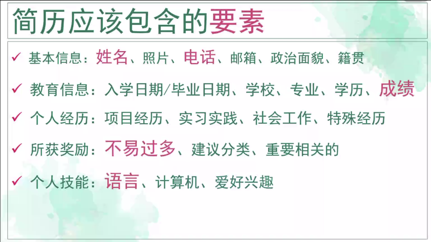 And then, Ms Wang shared some tips about making a CV and taking interviews with students from different aspects. She said that a standard CV should include five elements, basic information, educational background, personal experience, awards and skills. She also explained the details and processes of campus interviews and company interviews.