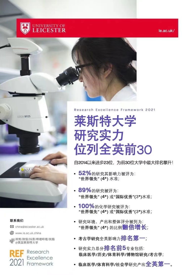 The University of Leicester focuses on academic research and has been contributing to the cultivation of top talents in various fields for more than a century of development. The outstanding performance in the Research Excellence Framework (REF) 2021 is the result of its outstanding academic research level and position. Nearly 89% of the research outputs of the University of Leicester have been rated as "world-leading" or "internationally excellent". Clinical Medicine, History, Sports Science, Museum Research and Archaeology ranked in the top 5 in the UK. All of the research results in Chemistry rated as "world-leading" or "internationally excellent". The University of Leicester will continue to work in leading areas, such as Aerospace, Human Health, Earth and the Environment, etc., and continue to be at the forefront of the world to solve the most serious and critical global problems.