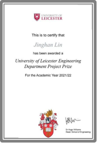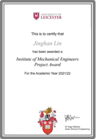 These awards recognize outstanding achievements in graduation projects by graduates. The "Engineering Department Project Prize" is an outstanding graduation project award from the University of Leicester, "Institute of Mechanical Engineering Project Award" and "I. The Mech.E Best Project Certificate” is awarded by the Institute of Mechanical Engineers (IMechE) for the excellent performance of the graduates in researching, developing and designing in the projects, in which, "I. The Mech.E Best Project Certificate” is nominated by the Head of Faculty and awarded after review and evaluation by IMechE, and only one graduate of each programme can receive the award.
